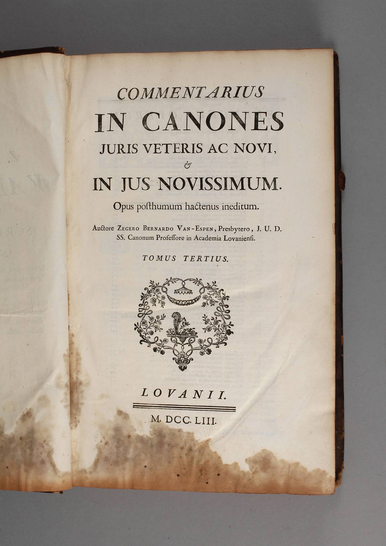 juris veteris ac novi, in jus novissimum, opus posthumum hactenus ineditum, auctore Zegero Bernardo Van-Espen, Tomus Tertius, Löwen 1753, Format Fol., XL und 657 S., Ledereinband, Rotschnitt, Schmuckvorsatz, Gelenke lösen sich, Wasserschaden auf den ersten Seiten, restliche Textseiten in schönem Zustand.