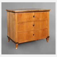 Weimar um 1820, wohl Birnbaum auf Nadelholz furniert, dreischübiger Korpus mit ebonisierten Zierleisten, eingelegte rautenförmige Schlüsselbeschläge, originale Schlösser, zwei Schlüssel, kleinere Furnierfehlstellen, restaurationsbedürftig H 82 x B 98 x T 55 cm.