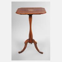 wohl England um 1830, Mahagoni massiv und furniert, sechsfach facettierter Fuß mit Fadeneinlage, Platte mit geometrischer Intarsie, restaurierter Trocknungsriss, Maße 77x37x47 cm.