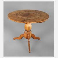 Weimar um 1830, Kirschbaum auf Nadelholz furniert, runde klappbare Platte, mit breitem intarsiertem Band mit Vogelaugenahorn, gesäumt von zwei Filetbändern, sechsfach facettierter Balusterfuß, die geschwungenen Beine mit eingelegtem dunklen Faden, guter unrestaurierter Originalzustand, H 80 cm, D 99 cm.