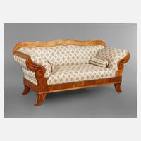 Weimar um 1820, Birke auf Nadelholz furniert, Lehnen seitlich mit stilisiertem Füllhorn verziert, Holz mit Alters- und Gebrauchsspuren, Bezug erneuert, rest. bed., Maße 96x195x66 cm.
