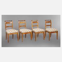 Weimar um 1830, heller Nussbaum massiv und furniert, trapezförmige Sitzfläche, leicht geschwungene Lehne mit gedrechseltem Abschluss, alt restauriert, Bezüge erneuert, eine gedrechselte Rolle mit Bruchstelle, H 89 cm, SH 48 cm.