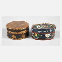 19. Jh., runde Deckeldose aus Pappmache mit ornamentalen Zierauflagen aus Bast, dazu ovale Spanschachtel in polychromer Bauernmalerei mit Umschrift Liebe mich allein, oder lass gar sein, Altersspuren, kleine Fehlstellen, L bzw. D je 11 cm.