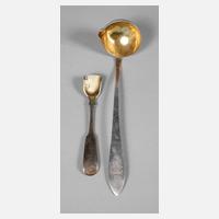kleine Kelle um 1800, ungedeutete Meisterpunze ICZ oder IGZ, dazu Kreuz mit Krone und Preußischer Steuerstempel für ältere Gegenstände, Tremolierstab, innen vergoldet, auf dem Griffende ein fein graviertes Wappen, dazu ein russischer Salzlöffel Moskau 1848, gestempelt 84 Zolotniky, unleserliche Meisterpunze, kyrillische Beschaumeistermarke LS, eventuell Ludvig Zug Riga, graviertes Besitzermonogramm D. Bz., ebenfalls vergoldete Laffe, L 9,5 und 17 cm, G zusammen ca. 38,4 g.