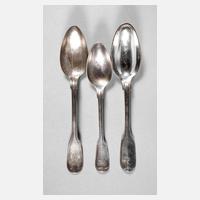 einer Wien 1844, gestempelt 13 Lot, einer 2. Hälfte 19. Jh., gestempelt 800 Halbmond Krone mit Monogramm Wolfgang Vulpius? sowie ein versilberter Löffel Berndorf mit Monogramm K. Vulpius, Gebrauchsspuren, G der beiden Silberlöffel ca. 115 g.