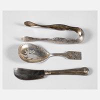 Branntweinlöffel G. Rob. Lindbäck Schweden 1920er Jahre, graviert mit Hirschmotiv mit Ornamentik, Buttermesser aus Horn mit versilbertem Griff sowie Zuckerzange Biedermeier mit geätztem Floraldekor, Silber geprüft, diese etwas gedellt, L max. 14 cm, G der beiden Silberteile ca. 43,3 g.