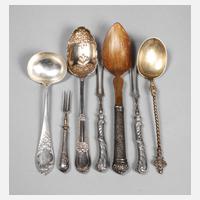 2. Hälfte 19. Jh., Silber gestempelt 800 Halbmond Krone, drei Kellen, ein Salatlöffel und drei Wurstgabeln, verschiedene Reliefdekore, teilweise vergoldete Laffen, eine Laffe aus Horn, teilweise stärkere Gebrauchsspuren, L max. 23 cm, G total ca. 313,4 g