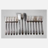 um 1910, monogrammiert E.V., Hersteller Theodor Müller Weimar, 90er Silberauflage, zwölf Kuchengabeln, Butter- und Käsemesser sowie ein Wurstgabel, normale Altersspuren.