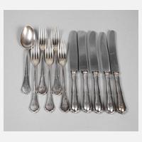um 1930, monogrammiert M.V., Silber gestempelt 800 Halbmond Krone, Herstellermarke Vereinigte Düsseldorfer Silberwarenfabriken, fünf Messer und fünf Gabeln sowie ein Löffel, Gebrauchsspuren, G total ca. 513,2 g.