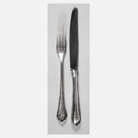 datiert 6.4.(19)31, monogrammiert H.W., Silber gestempelt 800 Halbmond Krone, Herstellermarke Vereinigte Düsseldorfer Silberwarenfabriken, Messer und Gabel mit schauseitigem Schriftzug Melchior, Messerklinge erneuert mit repariertem Ansatz, G toal ca. 106,8 g.