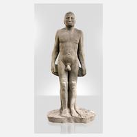 um 2002, unsigniert, Sandstein gehauen, leicht abstrahierte Darstellung eines stehenden Männeraktes, Witterungsspuren, an den Beinen fachgerecht ausgeführte Reparatur oberhalb der Knie, H 219 cm. Bei dieser Figur handelt es sich um die größte Steinskulptur aus dem Oevre des Künstlers. Beigegeben Broschüre des Künstlers mit Bildern, die die Herstellung der Figur dokumentieren. Lit. vgl.: Der Bildhauer Fritz Böhme 2012, S. 116–117. Künstlerinfo: deutscher Bildhauer und Plastiker (1948 Glauchau bis 2013 Hohndorf), Ausbildung zum Steinmetz und Steinbildhauer, widmete sich der Bildhauerei als Autodidakt, arbeitete in Holz, Stein und Keramik, erhielt den Rietschel-Preis und den Pechstein-Preis. Quelle: Internet.