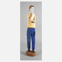 unter dem Sockel handschriftlich bezeichnet Fritz Best und datiert 1961, Holz geschnitzt und polychrom koloriert, Darstellung eines stehenden Mannes, die Arme verschränkt und eine Hand sinnend zum Kinn erhoben, partiell kleinere Farbverluste, auf der Hose ein dunkler Fleck, H ca. 69 cm.
