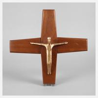 um 1970, rückseitig originales Klebeetikett, bezeichnet Paul Brandenburg Bildhauer, sowie handschriftliche Annotation, Mahagoni massiv und Bronze gegossen, stilisierter Korpus Christi, H 38 cm.