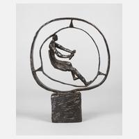 2. Hälfte 20. Jh., unsigniert, Metallguss dunkel patiniert, abstrakte Darstellung eines Autofahrers, mit Steuerrad und Sitz, in zwei partiell verbundenen Metallreifen, in bewegter Oberflächengestaltung, auf rechteckiger Plinthe, gut erhalten, H gesamt ca. 18,5 cm.
