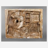 in der Art von Fritz Wotruba, unsigniert, vermutlich aus einem mehrteiligen Zyklus, Stukko teils hellbraun staffiert, abstrakte Darstellung von Menschen in einer Umgebung von runden und kubischen Formen, teils stärkere Altersspuren und kleinere Beschädigungen am Rand, Maße 101 x 124 cm.