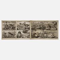 drei Blatt mit je vier Feldern, mit Darstellung diverser Vögel vor idealisierter Landschaft, dabei Falke, Eule, Wiedehopf, Reiher, Truthahn, Pfau, Eisvogel und andere, Blätter aus einer 20-teiligen Serie um 1640, Kupferstiche auf Bütten, je unten in der Darstellung signiert ”Gerh. Altzenbach exe.”, unterschiedliche Erhaltungszustände, ungerahmt, Plattenmaße je ca. 26,5 x 38 cm. Künstlerinfo: auch Gerard Alzenbach, dt. Kupferstecher, Drucker, Verleger und Kupferstichhändler (erwähnt 1609 bis nach 1680), um 1609 ist ein Kupferstichhändler und Verleger Gerhard Altzenbach (vor 1590 bis nach 1645) als Bürger von Köln im Druckerviertel am Dom bezeugt, er wurde auch als Mützenstricker und ”Heiligentrucker [Heiligendrucker]” bezeichnet, um 1612 erlangt der Verlag Gerhard Altzenbach ein 10-jähriges bischöfliches Privileg zur Herstellung von Flugblättern zur Reliquienverehrung, 1634 erfolgt die offizielle Kölner Bürgerrechtserteilung an einen ”Gerhardt Altzenbach”, schließlich wird 1656 erneut einem ”Gerhardt Altzenbach” das Kölner Bürgerrecht verliehen und 1668 folgt Wilhelm Altzenbach, Wilhelm Altzenbachs Sohn ist 1665 schließlich als Guillaume Altzenbach in Paris tätig erwähnt, möglicher Weise handelt es sich um Söhne, Enkel bzw. Urenkel etc. des Firmengründers, die Altzenbachs waren tätig als Kupferstecher für Matthäus Merian den Älteren (1593–1650), Zusammenarbeit mit Wenzel Hollar (1607–1677), 1620–60 Herausgabe der offiziellen Jahreskalender des Kölner Stadtrates, parallel bis ca. 1626 in Lüttich tätig, später auch in Straßburg tätig erwähnt, Quelle: Thieme-Becker, AKL, Wikipedia, Bénézit, Nagler, Saur ”Bio-Bibliographisches Künstlerlexikon” und Peter H. Meurer in ”History and Carthography” Ausgabe Mai 2016.