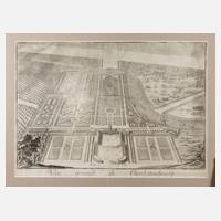 Blick aus der Vogelschau auf die Schlossanlage und den Park von Charlottenburg in Berlin, detailreiches, großformatiges Blatt, unter der Darstellung betitelt „Vüe generale de Charlottenbourg“, aus Merian „Theatrum Europaeum“, Kupferstich auf schwachem Bütten, um 1717, unter der Einfassungslinie in der Platte signiert „Eosander de Göthe invent“ und „Martinus Engelbrecht sculpsit Berlin“, mittig übliche Faltlinie, geringe Erhaltungsmängel, unter Passepartout und hinter Glas gerahmt, Darstellungsmaß ohne Schrift 40,5 x 59 cm. Künstlerinfo: dt. Kupferstecher und Kunstverleger (1684 Augsburg bis 1756 Augsburg), mit seinem Bruder Christian (1672–1735) als Ornament- und Vedutenstecher in Augsburg tätig, um 1708 Aufenthalt in Berlin, fertigte hier Stiche nach Entwürfen von Eosander von Göthe, darunter zwei Stiche aus dem Porzellankabinett des Schlosses Charlottenburg, sein Oeuvre umfasst mehr als 3000 Arbeiten, meist Stadtansichten, Ornamentstiche, Bildnisse, militärische und geschichtliche Ereignisse sowie allegorische Darstellungen, Quelle: Thieme-Becker und Wikipedia.