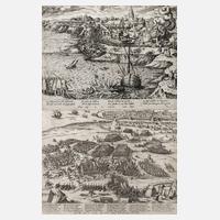 zwei Blatt aus dem 1570 erstmals erschienen Werk ”Geschichtsblätter”, Darstellung des Angriffs auf Osterweell vom Meer aus im Jahre 1567 und Belagerung der französischen Stadt La Rochelle im Jahre 1563, unter der Darstellung, in der Platte Text zur Darstellung, Kupferstich auf dünnem Bütten, 1570 oder etwas später, geringe Altersspuren, unter Passepartout und hinter Glas in Bilderträger, Passepartoutausschnitt ca. 21 x 28 cm. Künstlerinfo: Maler, Kupferstecher und Verleger (vor 1540 in Mecheln bis um 1590 in Köln), Stiefvater war der Kartenmacher Hendrik Terbruggen (Pontanus), Zuflucht in Köln 1570, nachdem er wegen der religiösen Unruhen in den Niederlanden verbannt wurde.