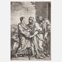 biblische Szene mit Darstellung Mariä Heimsuchung, die mit Jesus schwangere Maria trifft ihre Base Elisabeth, Kupferstich auf Bütten, 2. Hälfte 17. Jh., links unten in der Platte signiert und ortsbezeichnet ”Carolus Maratus in. et fecit Romae”, rückseitig diverse Sammlerstempel und neuzeitliche Bleistiftannotation ”Ein Hauptblatt des Meisters Carlo Maratti, geb. 1625, gest. 1713”, auf die Darstellung geschnitten, Ecken alt restauriert, Falt- und Altersspuren, ungerahmt, Blattmaße ca. 20,5 x 15 cm. Künstlerinfo: eigentlich Maratta, genannt auch Carolus Maratus, Marattus, Morato, Moratta, Moratti oder Maratto, italienischer Maler, Freskant, Zeichner, Plastiker und Radierer (1625 Camerano in der Region Marken bis 1713 Rom), ab 1636 in Rom und Schüler seines Stiefbruders Bernabeo Maratti, parallel Schüler und 19 Jahre Mitarbeiter von Andrea Sacchi, beeinflusst von der Kunst des Antonio da Correggio (1489–1534), Raffaels, Annibale und Agostino Carracci sowie schließlich Pietro da Cortona (1596–1669), 1653–54 Ausführung von Fresken in Florenz, stand im Auftrag von Papst Alexander VII., unterhielt eine Werkstatt mit Mitarbeitern und Schülern in Rom, 1700 zum Präsidenten der Accademia di San Luca berufen, 1702 Ernennung zum Konservator der römischen Antiken durch Papst Clement XI., in der Folge Restaurierung der Fresken Raffaels, 1704 durch Papst Clements XI. zum Ritter geschlagen, ab 1704 Hofmaler des frz. Königs Ludwig XIV., tätig in Rom, Quelle: Thieme-Becker, Nagler, Bénézit und Wikipedia.