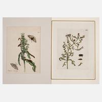 Darstellung der blühenden Gartenkresse und des Spitzampfers, jeweils von zahlreichen Insekten umgeben, aus dem ab 1679 erscheinenden Werk „Der Raupen wunderbare Verwandlung und sonderbare Blumennahrung“, kolorierte Kupferstiche auf verschiedenen Papieren, Plattenmaß ca. 15 x 11,5 cm. Künstlerinfo: dt. Malerin und Entomologin (1647 Frankfurt/Main bis 1717 Amsterdam), jüngstes Kind von Matthäus Merian dem Älteren, lernte schon im Kindesalter die verschiedenen Drucktechniken im Betrieb des Vaters kennen, ihr Stiefvater Jacob Marell weckte bei ihr das Interesse an der Blumenmalerei, 1675/80 veröffentlichte sie ihr dreibändiges „Neues Blumenbuch“, 1679 erschien ebenfalls in Nürnberg “Der Raupen wunderbare Verwandlung“, seit 1691 in Amsterdam ansässig, ab 1699 zweijährige Forschungsreise nach Surinam, als Ergebnis ihrer Forschung erschien „ Metamorphosis Insectorum Surinamensium“, eines der bedeutendsten Werke der frühen Naturwissenschaft, Quelle: Thieme-Becker, Wikipedia und Internet.
