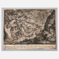 Gruppe von Jägern, einen Eber angreifend, unter der Darstellung betitelt „Wie auf die Schweine angestandten wird“ sowie Legende, Kupferstich, Mitte 18. Jh., rechts unten in der Platte bezeichnet „I. El. Ridinger inv. Pinx sculps et exc...“, Erhaltungsmängel, ungerahmt, Darstellungsmaß ohne Schrift ca. 27 x 38 cm. Künstlerinfo: dt. Maler, Graphiker und Verleger (1698 Ulm bis 1767 Augsburg), Schüler seines Vaters Johann Ridinger, ab ca. 1711 Schüler des Malers Christoph Resch in Ulm, ab 1713–14 bei Johann Falch in Augsburg, durch Vermittlung von Gabriel Spitzel drei Jahre im Diensten Graf Metternichs in Regensburg, ab ca. 1718 Schüler der Augsburger Stadtakademie bei Georg Philipp Rugendas dem Älteren, hier 1757 zum “Assesor des evangelischen Ehegerichts” und 1759 zum Direktor der Stadtakademie ernannt, wurde durch Tier- und Jagddarstellungen berühmt, die einen Hauptteil seines Schaffens ausmachten, Quelle: Thieme-Becker, Wikipedia und Internet.