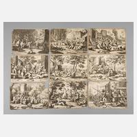 neun von 12 Blatt, je mit der bildlichen Darstellung eines Monats und im Bereich des Himmels findet sich das passende Sternzeichen, Blätter für Februar, April und Juli fehlen, Kupferstiche, um 1690, in der Platte signiert „P van Somer In ex...“ und „chez Landry auec pri du Roy“, teils stärkere Erhaltungsmängel, Blattmaß ca. 28 x 25 cm. Künstlerinfo: niederl. Maler, Schabkünstler und Kupferstecher (um 1649 Amsterdam bis um 1694), Bruder des Jan van Somer, lebte um 1690 in London, Quelle: Thieme-Becker.