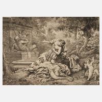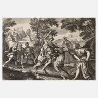 Darstellung der antiken Sage um die tragische Liebesgeschichte von Pyramus und Thispe aus Ovids ”Metamorphosen”, auf Grund der verfeindeten Eltern, welche sich als Nachbarn nicht vertragen, können die sich liebenden Pyramus und Thisbe nur durch einen Spalt in der Hauswand miteinander kommunizieren, sie vereinbaren für ihre Flucht ein nächtliches Treffen unter einem Maulbeerbaum, die zuerst am Treffpunkt ankommende Thisbe muss vor einer am Brunnen trinkenden Löwin fliehen und verliert auf der Flucht ihren Schleier, der von der Löwin zerrissen und mit Blut befleckt wird, der kurz darauf eintreffende Pyramus findet den Schleier und ersticht sich aus Trauer mit seinem Schwert, Thisbe findet den Sterbenden und wählt, wie in vorliegender Arbeit sichtbar, das gleiche Schicksal, Radierung auf Bütten, Mitte 17. Jh., seitenverkehrte Wiedergabe des Motivs der Radierung von Cornelis Schut I. (1597–1655), auf Papier aufgeheftet, rs. Montierungsreste und Sammlerstempel, auf die Plattenkante geschnitten, ungerahmt, Blattmaße ca. 16,5 x 23 cm.