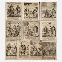 barocke Serie von neun Darstellungen mit je zwei abgebildeten Herrschern und Sinnspruch zu deren Leben, dabei Heinrich I. und Otto I., Heinrich V., Lothar II., Karl der Große und dessen Sohn Ludwig I. (der Fromme) und andere, Kupferstich auf Bütten, je in der Darstellung bezeichnet, dazu Allegorie auf die Tugend des Sparens, Kupferstich auf Bütten, um 1750, unterschiedliche Erhaltungen, ungerahmt, Blattmaße je ca. 21 x 17 cm.