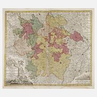 links unten figürliche Kartusche, hierin betitelt „Mappa Geographica in qua Ducatus Lotharingiae et Barr…. Tob Conrad Lotter“, Darstellung des Gebietes zwischen Luxemburg im Norden, Hagenau im Osten, Hericourt im Süden und Sainte-Menehould im Westen, kolorierter Kupferstich auf Bütten, um 1750, mittig Faltspur, leichte Erhaltungsmängel, Darstellungsmaß ca. 49,5 x 57 cm. Künstlerinfo: auch Tobias Conrad Lotter, dt. Landkartenstecher, Kartograph und Verleger (1717 Augsburg bis 1777 Augsburg), ab 1740 Schwiegersohn und produktivster Mitarbeiter des Karthographen und Verlegers Matthäus Seutter, 1740–44 schuf er eigenverantwortlich unter Seutter den „Atlas Minor“, nach dem Tode von Seutter (1757) führten sein Sohn Albrecht Karl (1722–1762) und sein Schwiegersohn Lotter sowie G. B. Probst die Firma weiter, 1757/58 wurde Lotter alleiniger Eigentümer des Verlags, Quelle: Thieme-Becker und Wikipedia