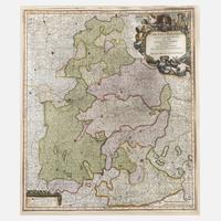 in oberer rechter Ecke prachtvolle, vielfigürliche Kartusche und hierin bezeichnet „Circulus Bavariae ... Matthaeo Seutter, Augustae-Vindelic.“, im unteren Bereich Legende und Meilenzeiger, Darstellung des Gebiets zwischen Efferding im Osten, Innsbruck im Süden, Nördlingen im Westen und Eger im Osten, Kupferstich mit Grenz- und teilweise Flächenkolorit, um 1750, leichte Erhaltungsmängel, unter Passepartout und hinter Glas gerahmt, Rahmen defekt, Darstellungsmaß ca. 56 x 48,5 cm. Künstlerinfo: auch Saiter, Seiter, Seuter Seyder, dt. Kartograph, Kupferstecher und Verleger (1678 Augsburg bis 1757 Augsburg), Sohn des Goldschmiedes Matthäus I., ab 1697 Lehre bei Johann Baptist Homann in Nürnberg, nach Augsburg zurückgekehrt, Mitarbeit im Verlag Jeremias Wolff, 1710 Gründung eines eigenen Verlages mit Druckerei, 1731 zum kaiserlichen Geographen ernannt, nach Seutters Tod 1757 wurde der Verlag durch seinen Sohn Albrecht Karl (1722–1762), den Schwiegersohn Tobias Conrad Lotter (1717–1777) und den langjährigen Mitarbeiter Johann Michael Probst (gest. 1805) weitergeführt, Quelle: Thieme-Becker und Internet.