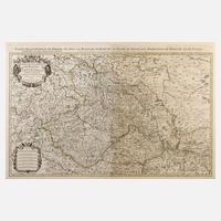 links oben prachtvolle, jagdliche Barockkartusche, hierin betitelt „Estats de la Couronne de Boheme qui comprennent le Royaume de Boheme le duche de Silesie et les Marquisats de Moravie et de Lusace.“ sowie Angabe zum Kartographen, Verlagsort und Verleger „Par le S. Sanson. Geographe ordinaire de Roy a. Paris Chez H. Iaillot joignant les grands Augustinus aux Globes Auec Provilege du Roy. Pour Vingt Ans 1692“ Kartograph Nicolas Sanson, 1692 verlegt bei Alexis Hubert Jaillot in Paris, Darstellung des Gebiets zwischen Neubrandenburg im Nordwesten, Krakau im Osten, Passau im Süden und Bamberg im Westen, links unten Meilenzeiger, oberhalb der Karte nochmals ausführlich betitelt, partiell kolorierter Kupferstich auf zwei Bögen Bütten, breitrandiges Exemplar, leichte Altersspuren, hinter Glas gerahmt, Darstellungsmaß ca. 58 x 87,5 cm. Künstlerinfo Sanson: frz. Kartograph (1600 Abbeville bis 1667 Paris), gilt als Begründer der französischen Kartographie, fertigte zwischen 1618–67 ca. 300 Karten, unterrichtete die Könige Ludwig XIII. und Ludwig XIV. in Geografie, Quelle: Wikipedia. Künstlerinfo Jaillot: auch Alexis Humbert Jailloteau oder Iaillot, frz. Kartenstecher und Elfenbeinschnitzer (ca. 1632 Avignon bei St.-Claude bis 1712 Paris), Bruder und Schüler des Pierre Simon Jaillot, ab 1657 mit diesem in Paris, 1664 Schüler der Académie de St.-Luc, heiratete 1665 als “sculpteur du roi (königlicher Kupferstecher)” die Tochter eines Kupferstichkartenhändlers und betätigte sich fortan als Kartenstecher, führt ab 1678 (oder 1686) den Titel “sculpteur et géographe ordinaire du Roi [dt.: Kupferstecher und einfacher Geograph des Königs]” und ab 1697 ein eigenes Wappen, tätig in Paris, Quelle: Thieme-Becker und Internet.