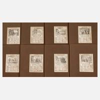acht von zwölf Kalenderblättern, jeweils mit miniaturhaftem Kupferstich und Spruch, im unteren Bereich Kalendarium, rückseitig typographischer Text, Kupferstich und Buchdruck auf Papier, 1. Hälfte 17. Jh., geringe Altersspuren, je unter Passepartout montiert, Blattmaß ca. 10 x 7,5 cm.