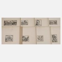 12 Blatt Textholzschnitte, mit der Darstellung von Helopolis, französische Landschaft mit Burg, Wollin, Hohen Kreigen, Eger, Wappen der Könige von Böhmen, Paris Gerichtsgebäude, Kloster Einsiedel, Halberstadt, Stargardt, Gallapfel und Sultan, aus Sebastian Münsters Cosmographie von 1548, jeweils unter Passepartout montiert und beschriftet, Darstellungsmaße max. 6 x 13,5 cm. Info: Sebastian Münster, dt.-schweizerischer Kosmograph, Humanist und Sprachkundler (1488 Nieder-Ingelheim bis 1552 Basel), studierte an der Ordensschule der Franziskaner in Heidelberg, 1505 Beitritt zum Franziskanerorden, unternahm zahlreiche Studienreisen, unter anderem nach Löwen, Freiburg/Breisgau, Rouffach und Basel, 1512 Priesterweihe in Pforzheim, 1514–18 Lektor an der Ordensschule der Franziskaner in Tübingen ab 1518 in Basel, 1524 Berufung als Professor an die Universität Heidelberg, 1529 Austritt aus dem Orden und als Professor in Basel tätig, hier ursprünglicher Herausgeber der erstmals 1544 erschienenen und bis 1628 in 46 weiter vervollkommneten Auflagen verschiedener Sprachen erschienenen ”Cosmographie (Weltbeschreibung)“, Quelle: Wikipedia.