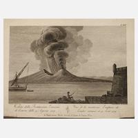 Blick vorbei an Stadtbefestigung und Angler, übers Meer auf den ausbrechenden Vesuv, Kupferstich auf Bütten, nach einer Zeichnung von Francesco Catozzo, unter der Darstellung italienisch und frz. betitelt ”Veduta della Trentesima Eruzione di Cenere delli 9. Agosto 1779 [dt.: Blick auf die dreißigste Eruption von Asche am 9. August 1779]”, rechts unter der Darstellung in der Platte signiert und datiert ”Gennaro Bartoli inc. ... 1804”, unten mittig Verlagsangabe ”In Napoli presso Nicola Gervasi al Gigante di Palazzo No. 23”, auf Karton aufgeheftet, Erhaltungsmängel, ungerahmt, Plattenmaße ca. 22 x 30 cm. Künstlerinfo: italienischer Kupferstecher (um 1765 bis nach 1817), galt als einer der besten Schüler von Johann Heinrich Wilhelm Tischbein (1751–1829) an der Kunstakademie Neapel, tätig in Neapel, Quelle: Thieme-Becker und AKL.