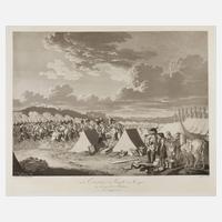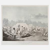 „Kürasier Regiment Schleinitz im Lager bei Berlin“, großformatige Darstellung des Lagerlebens, teils getönte Aquatintaradierung auf Bütten, um 1810, unter der Darstellung in der Platte bezeichnet “gezeichnet von Carl W. Kolbe“ und “geaetzt von F. Frick“ , mittig unter der Darstellung betitelt “Kürasier Regiment Schleinitz im Lager bei Berlin“ und bezeichnet zu „finden bei F. Frick, Friedrich Strasse Nr 248 in Berlin“ , minimale Altersspuren, ungerahmt, Darstellungsmaß ca. 40 x 51 cm, Blattmaß ca. 62 x 76 cm. Künstlerinfo: auch Johann Friedrich Frick, dt. Kupferstecher (1774 Berlin bis 1850 Kreuznach), ab 1809 Akademieprofessor in Berlin, Quelle: Thieme-Becker.
