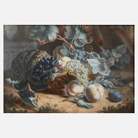 dekoratives Arrangement aus Weintrauben, Pfirsichen und Brombeeren im Weidenkorb, neben Kürbissen und Pflaumen, die Darstellung besticht durch ihre gekonnt erfasste Stofflichkeit und Raumwirkung mit trefflichem Licht, gleichwie die liebevollen Details wie Tautropfen auf dem frischen Obst und naturalistisch erfasste Insekten, seltene handkolorierte Lithographie, um 1850, links unten in der Platte signiert ”Eug. Grobon”, schön hinter Glas in ca. 12 cm breiter Jugendstil-Goldstuckleiste gerahmt, Falzmaße ca. 43,5 x 62,5 cm. Künstlerinfo: eigentlich Anthelme-Eugène Grobon, frz. Maler, Zeichner und Lithograph (1820 Lyon bis 1878 Grigny/Rhône), Bruder und Schüler des Malers, Lithographen, Freskanten und Porzellanmalers Francois-Frédéric Grobon (1815 Lyon bis 1901 oder 1902 Lyon), 1834–35 und 1840–41 weitergebildet an der École des Beaux-Arts (Kunstschule) Lyon bei Jean-Claude Bonnefond und Victor Orsel, veröffentliche 1844–50 in Zusammenarbeit mit seinem Bruder unter der Firmierung ”Gebrüder Grobon” Lithos, unter anderem ein Mappenwerk mit Blumen- und Fruchtstücken in der Art von Pierre-Joseph Redouté (1759 St. Hubert bis 1840 Paris) bzw. im Auftrag der Gesellschaft der Freunde der Künste Lyon nach unveröffentlichten Zeichnungen von Antoine Berjon (1754 Lyon bis 1843 Lyon), beschickte 1846–47 die Kunstausstellungen in Lyon und 1852–70 den Pariser Salon, erhielt diverse Ehrungen, wie 1858 Silbermedaille Dijon und Bronzemedaille in Rouen, tätig in Lyon, Quelle: Thieme-Becker, Saur ”Bio-Bibliographisches Künstlerlexikon”, Bénézit und Internet.