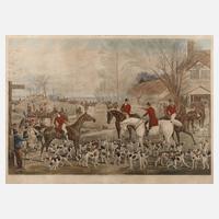 zur Fuchsjagd aufbrechende Gruppe von Reitern zu Pferde, umgeben von zahlreichen Hunden in hügeliger Landschaft, Blatt aus der Grafikfolge „Fox Hunting“, in der Platte oberhalb der Darstellung betitelt „Fox Hunting“ sowie im unteren Bereich „The Meet“, Farbaquatinta, 1844, unterhalb der Darstellung links signiert „Painted by H. Alken“ für Henry Alken und rechts „Engraved by J. Harris“ für John Harris, erschienen bei R. Ackermann at his Eclipse Sporting Gallery, Altersspuren, unter Passepartout und hinter Glas gerahmt, Darstellungsmaß ohne Schrift 42 x 62 cm.