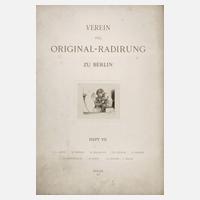 an einer Bank sitzender kleiner Junge beim Bearbeiten einer Kupferplatte, beobachtet von einem überdimensionierten Stichel, nach einer Vorlage von Adolf von Menzel, gestochen von Gustav Eilers, erschienen auf Deckblatt für das Heft 7 des Vereins für Originalradierung zu Berlin im Jahre 1892, Radierung auf gewalztem Chinapapier, in der Platte monogrammiert ”A.M.” und signiert ”G. Eilers rad.”, angeschmutzt, Plattengröße ca. 13 x 18 cm, Blattmaß ca. 62,5 x 45 cm.