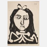 Frontalportrait einer langhaarigen Frau mit großer Schleife im Haar, gespannt den Betrachter anblickend, Lithographie auf Velinkarton, unsigniert, im Stein oben rechts spiegelbildlich datiert „16.2.(19)49“, leichte Erhaltungsmängel, ungerahmt, Blattmaß ca. 43,5 x 32 cm. Künstlerinfo: spanischer Maler, Graphiker und Bildhauer (1881 Malaga bis 1973 Mougins), studierte 1895 an der Kunsthochschule Barcelona, 1897 kurzzeitig an der Akademie San Fernando in Madrid, 1900 erster Parisaufenthalt, 1903 Übersiedlung nach Paris, tätig auch in Vallauris, Antibes, Aix-en-Provence und Mougins, Quelle: unter anderem Thieme-Becker, Vollmer und Wikipedia.