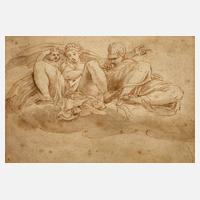 in Tücher gehüllte Frau, mit behelmtem Krieger und Putto auf einer Wolke ruhend, Tuschefeder in Braun, teils laviert auf Bütten, 18. Jh., unsigniert, Altersspuren, in alten Rahmen mit Museumsverglasung freistehend gerahmt, Blattmaß ca. 12 x 17 cm.