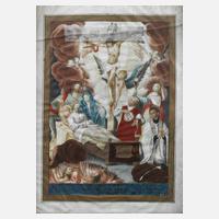 der im Bett liegende Josef, umgeben von Maria und Jesus, im Hintergrund Christus am Kreuz, umgeben von zahlreichen Engeln und Geistlichen, im unterem Bereich Sinnspruch „Jesus steh mir bey! Vor mich Maria bitt in den Todt Ach Liebe Schutzpatron! Verlasse mich nicht in letzter noth“, miniaturhafte Temperamalerei auf Pergament, 18. Jh., geringe Erhaltungsmängel und Verluste, hinter Glas gerahmt (Scheibe defekt), Darstellungsmaß ca. 22,5 x 16,5, Blattmaß ca. 27 x 21 cm.