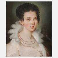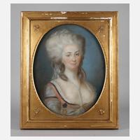 klassizistisches Brustbildnis einer jungen Frau mit üppiger, gepuderter Perücke und Perlenkette mit Medaillon über tief ausgeschnittenem Dekolleté, auf der rechten Seite trägt die Dargestellte den Sternkreuzorden (Ordo Stellatae Crucis) am schwarzen Band, der 1668 von Kaiserin Eleonore Magdalena Gonzaga (1628 Mantua bis 1686 Wien), der dritten Ehefrau des österreichischen Kaisers Ferdinand III. gestiftete ”Hochadelige Frauenzimmer-Sternkreuzorden” war lediglich Damen des Hochadels vorbehalten und verpflichtete die Trägerin zu tugendhaftem Leben, strenger Religiosität und tätiger Barmherzigkeit, 1688 erhob Eleonore Magdalene von Pfalz-Neuburg (1655 Düsseldorf bis 1720 Wien) als Gemahlin des Habsburger Kaisers Leopold I. den Orden zum höchsten Damenorden, die Aufnahme in den Orden entsprach dem männlichen Ehrentitel eines Kämmerers, eventuell handelt es sich bei dem hier vorliegenden Portrait um ein Bildnis der spanischen Prinzessin und Königin von Portugal und Brasilien Charlotte Joachime von Spanien (1775 Aranjuez bis 1830 Queluz), feine Pastellzeichnung auf Bütten, um 1790, unsigniert, geringe Altersspuren, hinter Glas und ovalem Bildausschnitt im Goldstuckrahmen (def.) gerahmt, Bildausschnitt ca. 52 x 41,5 cm.