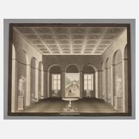 Blick in einen klassizistischen Raum, mit Statuen in den Wandnischen, die geöffnete Tür gibt den Blick auf eine Baumallee mit Tempel frei, aquarellierte Tuschezeichnung auf Bütten, rechts unten signiert, bezeichnet und datiert „A. Andersen Wien 22.10.(18)32“, hinterlegter Einriss, leichte Erhaltungsmängel, ungerahmt, Blattmaß ca. 40,5 x 52,5 cm.