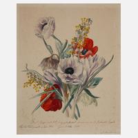 Bukett mit Frühlingsblühern, unter der Darstellung alt gewidmet, Aquarell auf leichtem Karton, 1882, rechts unten signiert „M. Berndt“ und datiert „27.3.(18)82“. leichte Erhaltungsmängel, ungerahmt, Blattmaß ca. 29,2 x 24,6 cm.