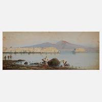 Muschelsammler an der Küste von Mergellina in Neapel, mit dem rauchenden Vesuv am Horizont, Gouache auf leichtem Karton, um 1870, links unten signiert „G. Gianni“, rückseitig betitelt „Napoli da Mergellina“, leichte Erhaltungsmängel, ungerahmt, Blattmaß ca. 9,7 x 22 cm. Künstlerinfo: auch Giancinto Gianni, ital. Landschaftsmaler (1837 bis 1895), Quelle: artprice und Internet.