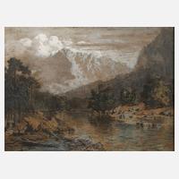 Blick vom steinigen Flusslauf, über Bäume am Ufer, zur imposanten Hochgebirgskulisse am Horizont, hierzu bemerkt Wikipedia: ”Er entnahm seine Motive vorzugsweise den deutschen und österreichischen Alpen, wobei er den Schwerpunkt auf Großartigkeit des Charakters legte.”, gekonnt studienhaft-flott erfasste Landschaftszeichnung, Mischtechnik (Tuschezeichnung sparsam aquarelliert), um 1830, links unten ligiert signiert ”HHeinlein”, Erhaltungsmängel, hinter Glas gerahmt (defekt), Falzmaße ca. 52 x 68 cm. Künstlerinfo: eigentlich Heinrich Carl Heinlein, dt. Landschaftsmaler und Zeichner (1803 Weilburg bis 1885 München), Gymnasium in Mannheim, zum Kaufmann bestimmt, schließlich der Familientradition folgend, Ausbildung zum Bauconducteur bei Bauinspector Dyberhoff und Weiterbildung bei seinem Oheim Karl Christian Riedel in Bayreuth, studierte ab 1822 Architektur bei Friedrich Gärtner an der Akademie München, parallel Ausbildung zum Landschaftsmaler, Studienabbruch wegen studentischen Duellierens, 1825 Studienreise nach der Schweiz, Tirol, Oberitalien und Wien, 1826 in Mannheim und Studien im Schwarzwald, ab 1830 in München tätig, ab 1945 Ehrenmitglied der Münchner Akademie, Quelle: Thieme-Becker, Allgemeine Deutsche Biographie, Matrikel der Münchner Akademie, Boetticher, Nagler und Wikipedia.