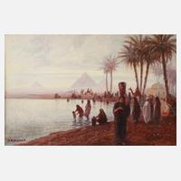 emsiges Treiben am Ufer des Nils und am Horizont die Pyramiden im warmen, dunstigen Licht des zur Neige gehenden Tages, Mischtechnik auf Karton, Ende 19. Jh., links unten signiert „A. Kircher“, minimale Erhaltungsmängel, hinter Glas in breiter Berliner Leiste gerahmt (Erhaltungsmängel), Blattmaß ca. 32 x 48 cm. Künstlerinfo: dt.-österr. Marine- und Landschaftsmaler (1867 Triest bis 1939 Berlin), Seeoffizierslaufbahn in der K. u. K. Kriegsmarine, nach Fußverletzung ab 1888 Studium der Malerei an der Akademie in Berlin, nachfolgend ausgedehnte Studienreisen, 1893 Mitwirkung an der Ausschmückung der Bauten auf der Weltausstellung in Chicago und Tätigkeit als Illustrator und Gestalter von Postkarten für verschiedene Verlage, 1895–1900 Professor an der Kunstakademie Triest, 1904 Übersiedlung von Triest nach Dresden, 1906 Umzug nach Moritzburg, Franz Joseph I. und Wilhelm II. beauftragten den Künstler mit zahlreichen Marine- und Flottenbildern, Quelle: Thieme-Becker, Wikipedia und Internet.