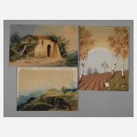 drei Blatt, gekonnt erfasste Aquarelle in schöner warmer Farbigkeit, um 1860, ein Blatt signiert „H. Kraemer“, ein Blatt monogrammiert „H.K.“ und eine Arbeit unsigniert, lichtrandig, ungerahmt, Blattmaß max. 24,2 x 18,2 cm. Künstlerinfo: dt. Landschaftsmaler (unbekannt bis 1886 Berlin), war tätig in Berlin, beschickte ab 1856 mehrmals die Berliner Akademie-Ausstellung und die Brüsseler Ausstellung, Quelle: Thieme-Becker, Singer und Bruckmann.
