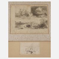 dabei Skizzenblatt der römischen Reise von 1873 mit vier Landschaftsszenen nebst Portraitskizzen, partiell lavierte Tuschezeichnung bzw. Bleistiftzeichnung sowie Waldstudie, Tuschezeichnung, unten ortsbezeichnet und datiert ”Lehen Juli (18)81”, je ins Passepartout montiert, hier sekundär in Bleistift zugeschrieben, Erhaltungsmängel, ungerahmt, Blattmaße maximal ca. 22 x 29 cm. Künstlerinfo: dt. Maler und Graphiker (1840 Stockach bei Konstanz bis 1902 München), Schüler in Aquarellmalerei bei Wagner in Freiburg, studierte 1856–64 an der Akademie Karlsruhe bei Schirmer, befreundet mit Hans Thoma, 1869 Aufenthalt in Dresden und bei Friedrich Preller dem Älteren in Weimar, 1871–75 Italienreise und Romaufenthalt, ab 1875 in Freiburg ansässig, ab 1887 in München, Quelle: Thieme-Becker und Wikipedia.