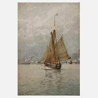 Segelschiff auf stiller See, unter effektvoll bewölktem Himmel, mit spitzem Pinsel stimmungsvoll erfasste Marinemalerei in fein abgestimmter Farbigkeit, Aquarell, links unten signiert und datiert ”E. de Martino (18)83”, geringe Altersspuren, freigestellt hinter Glas gerahmt, Blattmaß ca. 17 x 12 cm. Künstlerinfo: auch Edoardo Federico oder Edward di Martino, italienischer Marinemaler (1838 Meta bei Neapel bis 1912 London), Schüler der Kunstschule Neapel, zunächst 1849–55 Marinemaler im italienischen Unabhängigkeitskrieg, anschließend in Montevideo tätig, ab 1868 in Rio de Janeiro ansässig und Studienaufenthalt in Porto Alegre, schuf als Hofmaler des Kaisers Don Pedro von Brasilien 1868–69 Schlachtenbilder aus dem Krieg mit Paraguay, beschickte 1870 die Kunstausstellung der Akademie Rio de Janeiro und wurde 1871 zum korrespondierenden Mitglied der Kaiserlichen Akademie der bildenden Künste Rio de Janeiro ernannt, ab 1875 in London und zeitweise in Cowes auf der Isle of Wight ansässig, 1892 Ernennung zum Ritter (Chevalier) des Ordens der Krone von Italien, ab 1895 ”Marine Painter in Ordinary to her Majesty Queen Victoria”, ab 1902 Commander des Royal Victorian Order, vertreten in der Sammlung des britischen Königshauses, Quelle: Thieme-Becker, Visitenkarte des Künstlers und Internet.